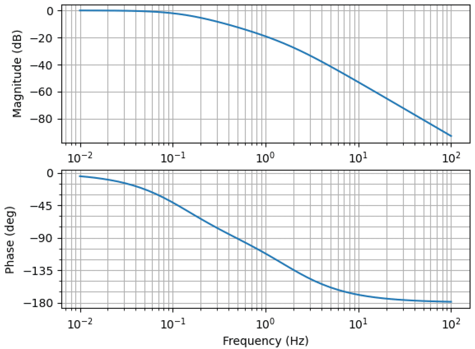パラメータは適当ですが、2次系の伝達関数でゲインが -40dB となっており、位相は 0° から -180° まで変化しているので正しく出力できているのではないかと思います。